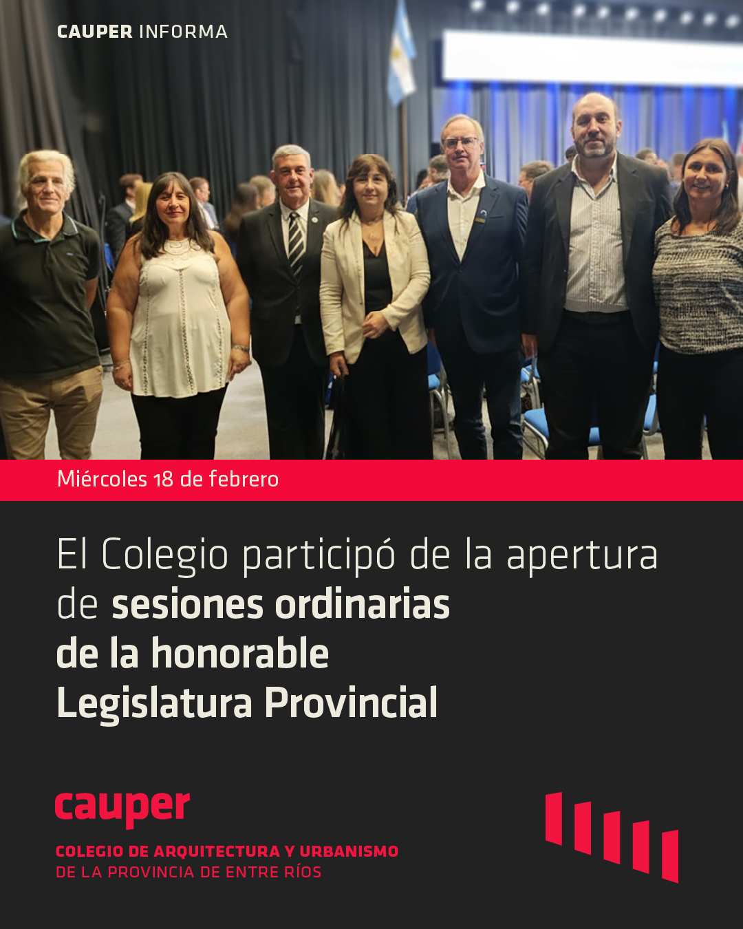 El Colegio de Arquitectos de la Provincia de Entre Ríos participó de la Ceremonia de Apertura del 147° Período de Sesiones Ordinarias de la Honorable Legislatura Provincial, realizada el miércoles 18 de febrero a las 11:00 horas en el Centro Provincial de Convenciones de la ciudad de Paraná.