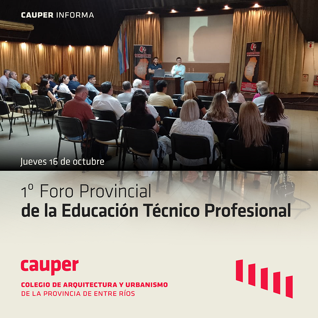 El jueves 16 de octubre, el Colegio de Arquitectos de Entre Ríos (CAUPER) participó en el 1er Foro Provincial de la Educación Técnico Profesional, realizado en el Salón de los Colegios, ubicado en calle España 279 de la ciudad de Paraná. La representación institucional estuvo a cargo del Arq. Eduardo Bruno, integrante del CoPeTyPER.