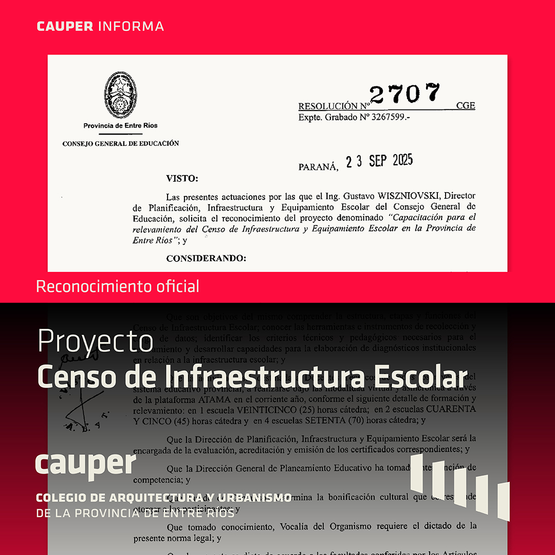 Mediante gestiones conjuntas entre el Colegio de Arquitectos de Entre Ríos (CAUPER) y el Director de Planificación, Infraestructura y Equipamiento Escolar del Consejo General de Educación, Ing. Gustavo Wiszniovski, se logró el reconocimiento oficial del proyecto “Capacitación para el relevamiento del Censo de Infraestructura y Equipamiento Escolar en la provincia de Entre Ríos”, aprobado por Resolución N.º 2707 CGE.