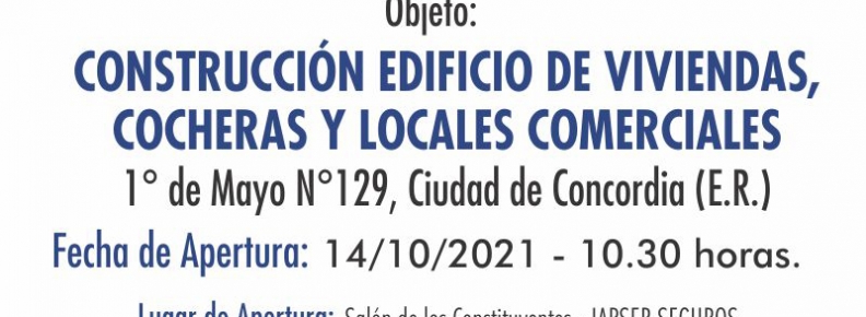 El IAPSER informa que está abierto el llamado a licitación para la construcción de un edificio de viviendas, cocheras y locales comerciales en la ciudad de Concordia. El proyecto definitivo surgió de un concurso de antecedentes realizado por el CAPER, y el presupuesto oficial es de $143.085.905. Además comunicamos que la fecha de apertura es el día 14 de octubre.