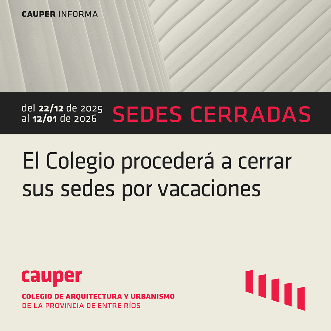 El Colegio de Arquitectos de la Provincia de Entre Ríos informa a su matrícula y a la comunidad que, conforme a lo establecido en la Resolución de Directorio N° 2031/25, el CAUPER iniciará su receso de verano el 22 de diciembre de 2025, retomando sus actividades administrativas y de atención habitual el 12 de enero de 2026.